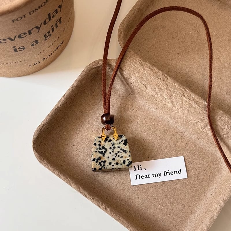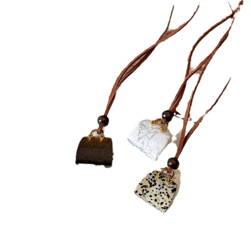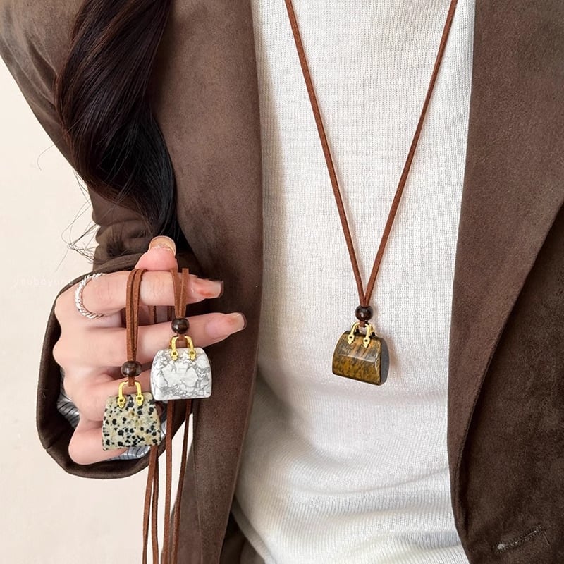 - Colors Available: Spotted stone bag necklace, white turquoise bag necklace, tiger eye stone bag necklace.